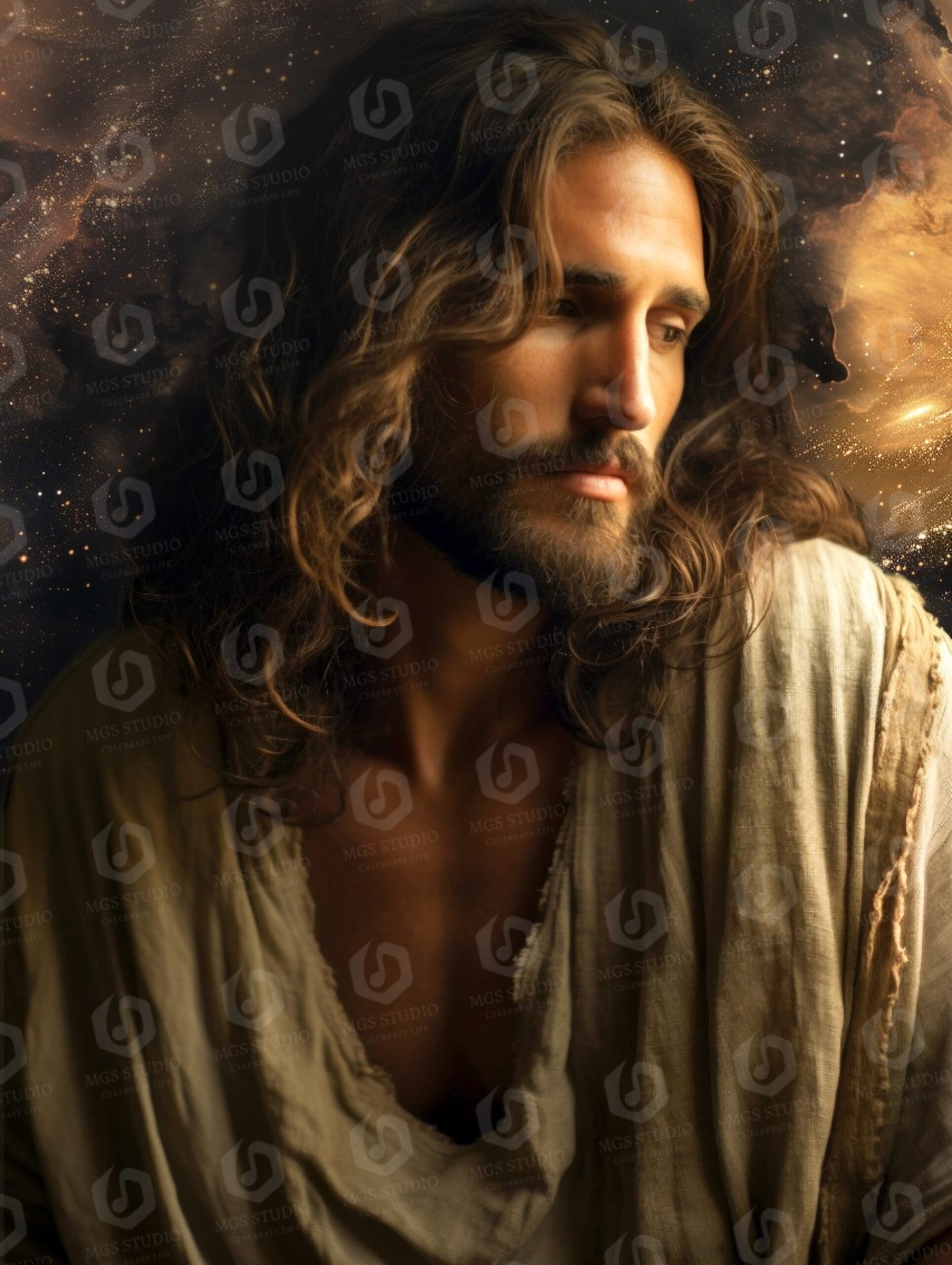 “Infinite Mercy” envisions Jesus as a bridge between the terrestrial and the celestial, embodying a divine grace that stretches across the boundless universe. His gaze is deep and penetrating, filled with compassion that transcends human limitations. The backdrop of the cosmos serves as an eternal testament to His omnipresence, with swirling galaxies and luminous nebulae symbolizing the limitless reach of His love and forgiveness. This cosmic landscape reminds viewers that divine mercy is not confined by time or space—it flows endlessly, touching every corner of existence.